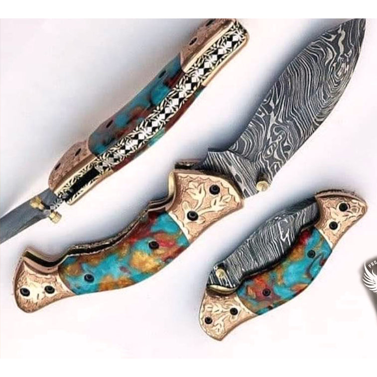 Handmade Damascus Steel and Tie & Dye Resin Handle Folding Knife with Engraved Bolster. Pro1471